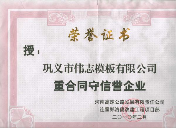 我们与安新项目合作取得的成果2009年12月15日刊登在《河南高速》报第二版(“方寸之间见精彩”)被河南高速公路发展有限公司安新改建工程项目部授予“重合同守信誉企业”、“国内质量一流模板企业”、“质量信得过单位”,被河南电视台授予“质量信得过单位”。